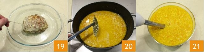 Um den Garzustand zu überprüfen, stechen Sie das Fleisch mit einem Zahnstocher an 19, wenn es klare Flüssigkeit verliert, ist das Fleisch genau richtig gegart, wenn rosa Flüssigkeit austritt, kochen Sie weiter. Wenn keine Flüssigkeit austritt, ist das Fleisch zu lange gekocht worden. Entfernen Sie nun die Lorbeerblätter 20 und die Knoblauchzehen aus dem Kochfond, geben Sie den Fond in eine Schüssel und pürieren Sie ihn mit einem Stabmixer 21