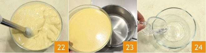 bis Sie eine cremige Sauce erhalten 22. Geben Sie die gewonnene Sauce in einen Topf 23, in der Zwischenzeit geben Sie ein paar Esslöffel kaltes Wasser in eine kleine Schüssel 24