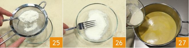 fügen Sie einen Esslöffel gesiebtes Mehl hinzu 25 und mischen Sie, um das Mehl zu lösen 26, dies verhindert Klumpenbildung in der Sauce. Fügen Sie dann das Mehl zur Sauce hinzu 27,