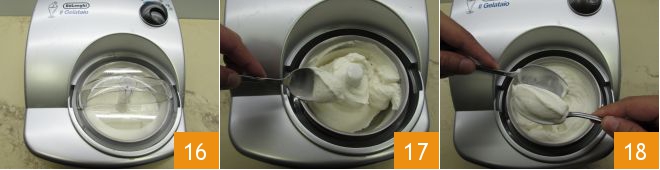 und schalten Sie sie ein 16. Das Rühren dauert etwa 40-50 Minuten, dieser Zeitraum kann jedoch je nach verwendeter Maschine variieren. Den restlichen Teil der Mischung können Sie im Kühlschrank aufbewahren und später verarbeiten. Sobald es eine cremige Konsistenz erreicht hat 17, können Sie die Maschine ausschalten. Wenn Sie es sofort genießen möchten, nehmen Sie mit zwei befeuchteten Löffeln einzelne Portionen „à la quenelle“ 18