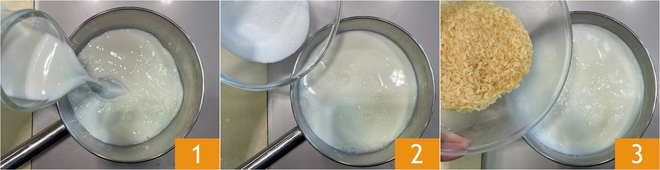 Um den Milchreis mit roten Früchten zuzubereiten, beginnen Sie damit, die Milch 1 und den Zucker 2 in einen kleinen Topf zu gießen, rühren Sie um und bringen Sie es zum Siedepunkt. Fügen Sie nun den Reis hinzu 3.