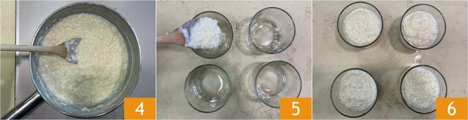 Kochen Sie weiter, indem Sie bei niedriger Hitze etwa 30 Minuten lang rühren, bis der Reis die gesamte Milch aufgenommen hat: Sie sollten eine cremige Konsistenz erhalten 4. Teilen Sie die Mischung in 4 Gläschen mit einer Kapazität von jeweils 190 ml 5 und stellen Sie sie zum Festwerden in den Kühlschrank 6.