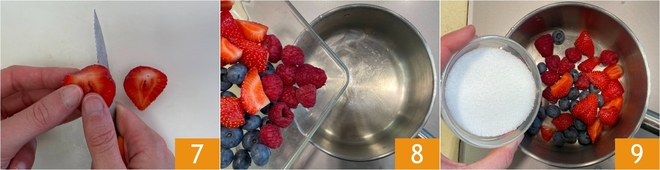In der Zwischenzeit widmen Sie sich der roten Fruchtsoße: Waschen Sie die Erdbeeren und schneiden Sie sie je nach Größe in Stücke 7. Geben Sie die Erdbeeren, Heidelbeeren und Himbeeren zusammen mit dem Zucker 9 in einen kleinen Topf 8.