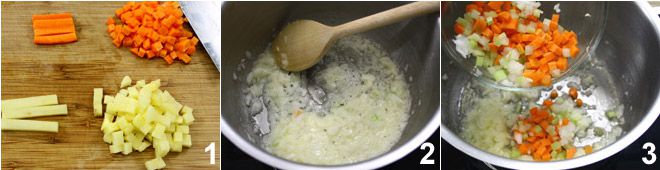 Legen Sie die Butter in einen Topf, und wenn sie geschmolzen ist, fügen Sie die Zwiebel hinzu und lassen Sie sie weich werden 2; werfen Sie auch die Karotten und den Sellerie in den Topf und lassen Sie sie 5 Minuten lang anbraten 3.