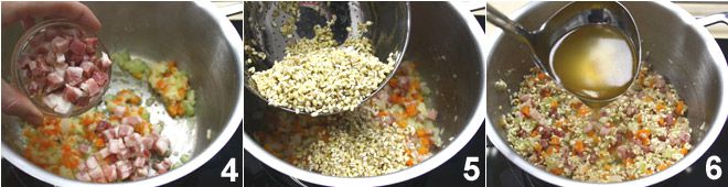 Fügen Sie auch den gewürfelten geräucherten Speck 4 und die Graupen hinzu, die Sie unter fließendem Wasser gewaschen und abgetropft haben 5. Fügen Sie 3 oder 4 Schöpflöffel Fleischbrühe zu den Graupen hinzu 6.