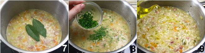 Wenn die Graupen gar sind, schalten Sie die Hitze aus, pfeffern Sie, fügen Sie den gehackten Schnittlauch 8, das Olivenöl extra vergine 9 hinzu und schmecken Sie mit Salz ab.