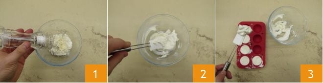 Um die Mini-Bavarois mit Paprika und Robiola zuzubereiten, beginnen Sie damit, den Käse mit einer Prise weißem Pfeffer 1 zu bearbeiten und rühren ihn mit dem Spatel 2 um. Füllen Sie die Masse in eine Silikonform und füllen Sie 10 Halbkugeln 3