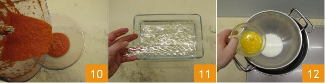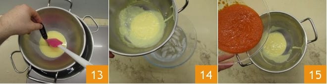 Erhitzen Sie die Mischung bei mittlerer Flamme und kochen Sie sie unter ständigem Rühren. Sobald die Temperatur zwischen 82°-85° liegt (messen Sie sie mit dem Thermometer), ist die englische Creme fertig. Denken Sie daran, dass Sie sie auch mit einem Löffel überprüfen können: Wenn beim Überstreichen mit dem Finger über den Spatel die beiden Enden getrennt bleiben, dann ist sie gekocht 13. Stoppen Sie das Kochen, indem Sie die Schüssel in eine Schüssel mit Eiswasser stellen und weitere 3-4 Minuten rühren 14. Danach geben Sie das Paprikapüree hinzu und rühren um 15.