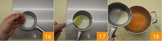 Erhitzen Sie die restlichen 20 Gramm Milch, ohne sie zum Kochen zu bringen, und fügen Sie die Gelatine hinzu 16, dann schalten Sie sie aus und rühren Sie gut um, um sicherzustellen, dass keine Klumpen entstehen; sollten welche vorhanden sein, erhitzen Sie sie noch für einen Moment 17. Fügen Sie sie der englischen Creme mit den Paprika hinzu 18