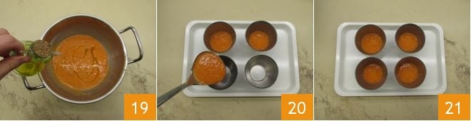 und passen Sie dann Salz, Pfeffer und Olivenöl extra vergine an und rühren Sie um 19. Füllen Sie nur den Boden von 5 Förmchen mit einer Kapazität von 120 ml 20 und stellen Sie sie für 20 Minuten in den Gefrierschrank 21.