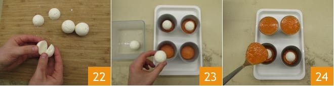 Nach der Zeit nehmen Sie die Halbkugeln heraus und verbinden Sie sie paarweise mit den Händen, um 5 Kugeln zu formen 22, setzen Sie die entstandenen Kugeln in die Förmchen 23, bedecken Sie sie mit dem Rest der Paprikacreme und stellen Sie sie für mindestens 5 Stunden in den Kühlschrank 24.