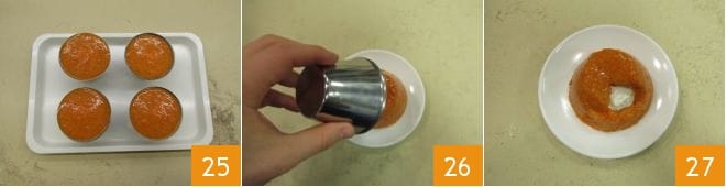 Nach der Zeit tauchen Sie die Förmchen für nicht mehr als 1 Sekunde in warmes Wasser 25 und stürzen Sie sie auf Servierteller 26. Garnieren Sie mit ein paar Basilikumblättern nach Belieben und Ihre Mini-Bavarois mit Paprika und Robiola sind fertig 27!