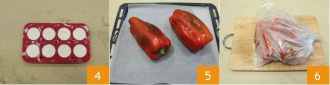 und frieren Sie sie ein 4. In der Zwischenzeit waschen und trocknen Sie die roten Paprika. Legen Sie sie auf ein mit Backpapier ausgelegtes Backblech 5 und backen Sie sie im Ofen bei 220° für etwa 50 Minuten und drehen Sie sie gelegentlich um. Am Ende der Garzeit legen Sie sie in einen Plastikbeutel und lassen Sie sie 20 Minuten abkühlen 6.