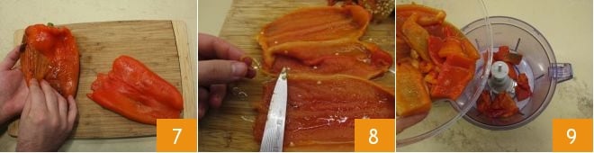 Dann schälen Sie sie 7 und reinigen Sie sie von innen, indem Sie die Samen und die Fasern entfernen 8. Pürieren Sie die Paprika im Mixer (besser nicht mit dem Stabmixer) und erhalten Sie ein glattes Püree 9.