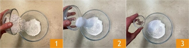 Um die Mini-Brötchen in der Heißluftfritteuse zuzubereiten, lasst zuerst die Butter schmelzen und abkühlen. Beginnt dann mit der Herstellung des Teigs: Gebt in eine Schüssel die beiden Mehle 1, den Zucker 2 und die zerbröckelte Hefe 3.