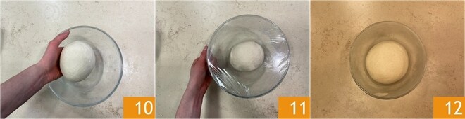 Formt aus dem Teig eine Kugel, indem ihr ihn spannt, und legt sie in eine Schüssel 10. Deckt ihn mit Frischhaltefolie ab 11 und lasst ihn 2 Stunden im ausgeschalteten Ofen nur mit eingeschaltetem Licht gehen, bis sich das Volumen verdoppelt hat 12.