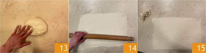 Nach dem Gehen den Teig auf eine Arbeitsfläche geben und mit den Händen flach drücken 13. Dann mit einem Nudelholz zu einem Rechteck ausrollen 14 und die Ränder bei Bedarf begradigen 15.