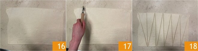 Das endgültige Rechteck sollte 42x28 cm groß sein 16. Markiert auf beiden langen Seiten des Rechtecks alle 7 cm 17 und verwendet diese Markierungen, um mit einem Teigrädchen 12 Dreiecke mit einer Basis von 7 cm auszuschneiden 18.