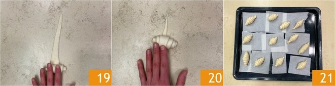Beginnt vom breiten Ende aus, die Brötchen zu rollen, indem ihr die Spitze vorsichtig zieht, um sie zu verlängern 19. Rollt weiter, indem ihr sie leicht zusammendrückt 20, sodass die Naht nach unten zeigt. Legt die Brötchen nach und nach auf Quadrate aus Backpapier und stellt sie auf ein Blech oder Tablett 21. Lasst die Brötchen im ausgeschalteten Ofen nur mit eingeschaltetem Licht für etwa 30 Minuten gehen.