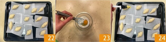 Nachdem die Brötchen gegangen sind 22, verquirlt das Ei mit der Milch 23 und verwendet es, um die ersten 4 Brötchen zu bestreichen 24.