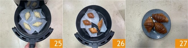 Legt sie dann in den Korb der Heißluftfritteuse (wir haben eine Fritteuse mit einem Fassungsvermögen von 6 Litern verwendet) 25 und stellt die anderen in den Kühlschrank. Backt die Brötchen in der Heißluftfritteuse bei 150° für 13 Minuten. Dann herausnehmen 26 und mit dem Backen der anderen fortfahren, indem sie nach und nach bestrichen werden, dann servieren 27.