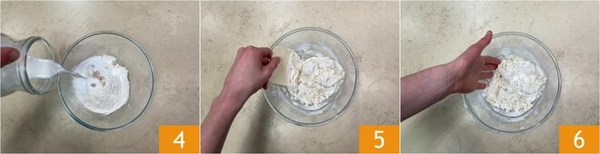 Gebt auch die Milch dazu 4 und vermischt die Zutaten mit einem Teigschaber 5, knetet dann mit den Händen 6.