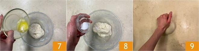 Wenn die Zutaten gut vermischt sind, fügt die Butter, die nun Zimmertemperatur hat, hinzu 7 und knetet weiter in der Schüssel, bis sie vollständig aufgenommen ist. Zum Schluss das Salz hinzufügen 8 und noch einmal kneten. Den Teig auf eine Arbeitsfläche geben und etwa 10 Minuten bearbeiten 9, bis er glatt ist.
