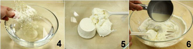 Fahren Sie mit der Zubereitung der Sahne fort: Weichen Sie die Gelatineblätter in einer Schüssel mit kaltem Wasser ein 4; in der Zwischenzeit nehmen Sie eine große Schüssel und vermischen Sie den Philadelphia-Käse mit dem Ricotta, sehr gut umrühren, um die beiden Käsesorten zu verbinden 5. Erwärmen Sie in einem kleinen Topf 50 ml frische Sahne, drücken Sie die Gelatineblätter aus und lassen Sie sie in der Sahne schmelzen. Nun fügen Sie die lauwarme Mischung aus Sahne und Gelatine zu den zwei Käsesorten und rühren Sie gut um, um sie zu verbinden 6.