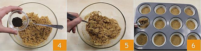 Rühren Sie die Mischung um und fügen Sie auch das Kaffeepulver 4 hinzu. Dann vermischen Sie die Zutaten, um einen homogenen Teig zu erhalten 5. Legen Sie eine Muffinform mit Papierförmchen aus. Verteilen Sie etwa 20 g der Mischung auf jedes Förmchen 6 und glätten Sie die Böden mit der Rückseite eines Teelöffels. Stellen Sie alles für mindestens eine halbe Stunde in den Kühlschrank (oder für 15 Minuten ins Gefrierfach).