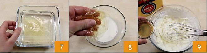 Bereiten Sie dann die Creme vor: Legen Sie die Gelatine für 10 Minuten in einer Schüssel mit kaltem Wasser ein 7. Nehmen Sie 30 ml flüssige Sahne von der gesamten Menge ab und erhitzen Sie sie bei niedriger Hitze in einem Topf; geben Sie sie dann in eine Schüssel und fügen Sie nach der erforderlichen Zeit die gut ausgedrückte Blattgelatine hinzu 8. Lassen Sie die Gelatine in der Sahne unter Rühren mit einem Teelöffel schmelzen und stellen Sie sie beiseite. In der Zwischenzeit geben Sie in einer großen Schüssel den Frischkäse und den Ricotta zusammen und vermengen sie gut mit einem Schneebesen. Fügen Sie dann den Puderzucker und den flüssigen Kaffee zur Käsecreme hinzu 9.