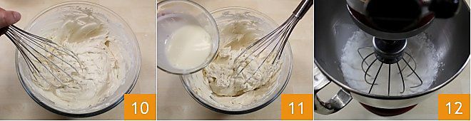 Rühren Sie die Mischung gut mit einem Schneebesen, bis Sie eine weiche und homogene Creme erhalten 10. Fügen Sie nun die in der Sahne gelöste Gelatine zur Käsecreme hinzu und rühren Sie mit dem Schneebesen, um die Zutaten zu vermischen 11. In einer Küchenmaschine (oder in einer großen Schüssel mit einem elektrischen Handrührgerät) schlagen Sie die restliche flüssige Sahne steif 12.
