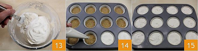 Wenn sie steif geschlagen ist, heben Sie sie vorsichtig mit einem Spatel von unten nach oben unter die Creme, um sie nicht zu entlüften 13. Nach einer halben Stunde nehmen Sie die Muffinform aus dem Kühlschrank und prüfen, ob die Böden fest geworden sind. Nehmen Sie einen Spritzbeutel und füllen Sie ihn mit der frisch zubereiteten Creme. Verteilen Sie die Creme gleichmäßig auf den Keksböden (ca. 30 g Creme pro Förmchen). Nachdem Sie alle Förmchen gefüllt haben, stellen Sie die Form erneut für etwa 30 Minuten in den Kühlschrank, um die Creme zu festigen (14-15).
