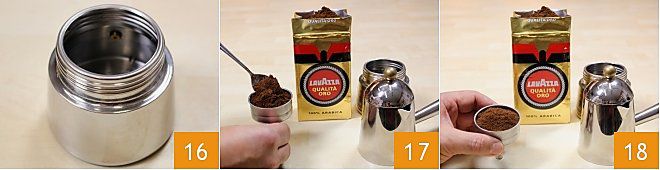 Während die Mini-Cheesecakes im Kühlschrank fest werden, können Sie sich dem Belag widmen. Beginnen Sie, den Kaffee mit der Moka-Kanne zuzubereiten: Geben Sie kaltes Wasser, vorzugsweise kalkarm, in den Kessel bis zum Sicherheitsventil 16 (ansonsten erhalten Sie einen längeren Kaffee). Füllen Sie den Filter mit gemahlenem Kaffee 17 und glätten Sie jeden hinzugefügten Teelöffel Kaffee, indem Sie den Filter mit entschlossenen Bewegungen auf den Tisch klopfen 18, bis er den Rand des Filters erreicht.