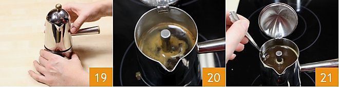 Drücken Sie nicht mit dem Teelöffel, bohren Sie keine Löcher und schrauben Sie die Kaffeekanne fest zu 19 (um zu verhindern, dass der Kaffee beim Aufstieg an den Seiten austritt), stellen Sie sie dann auf eine niedrige und konstante Flamme, um einen kräftigen Kaffee zu erhalten. Während der Kaffee hochsteigt, bildet sich ein dichter Schaum 20; wir empfehlen, den Kaffee nicht zu lange köcheln zu lassen, um Aroma und Süße zu bewahren. Schalten Sie dann den Herd aus, und Ihr Kaffee für die Zubereitung ist fertig: Rühren Sie ihn direkt in der Moka-Kanne mit einem Teelöffel um, um ihn homogener zu machen 21.