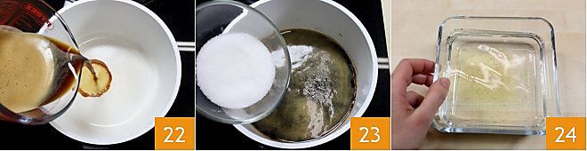 Gießen Sie den noch heißen Kaffee in einen großen Topf 22, fügen Sie bei ausgeschaltetem Herd den Zucker hinzu 23 und rühren Sie um, um den Zucker aufzulösen. Weichen Sie inzwischen die Gelatine für 10 Minuten in kaltem Wasser ein 24.