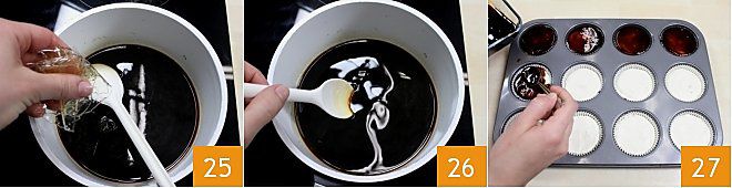 Nachdem die erforderliche Zeit vergangen ist, drücken Sie sie aus und fügen Sie sie zum gezuckerten Kaffee hinzu 25, rühren Sie mit einem Holzlöffel bei ausgeschaltetem Herd, bis die Gelatine vollständig geschmolzen ist und das Kaffee-Gelee dick und cremig wird 26. Nehmen Sie die Mini-Cheesecakes aus dem Kühlschrank und geben Sie das Kaffee-Gelee mit einem Teelöffel in jedes Förmchen 27.