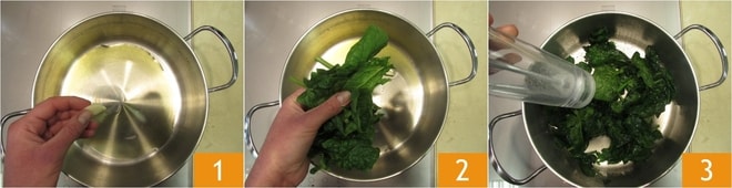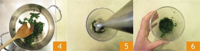 Kochen Sie 5 Minuten lang bei starker Hitze unter Rühren, bis sie verwelkt sind. Entfernen Sie den Knoblauch 4, geben Sie den gekochten Spinat in ein hohes Glas und pürieren Sie ihn mit einem Stabmixer 5. Bewahren Sie die entstandene Creme auf 6.