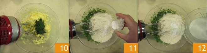 Geben Sie auch den pürierten Spinat in die Schüssel 10, arbeiten Sie schnell mit dem Mixer und fügen Sie das Mehl, das Backpulver und die Milch hinzu 12.
