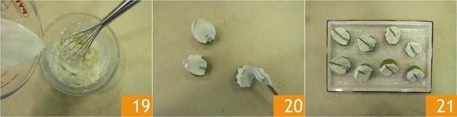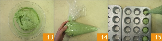 Bearbeiten Sie die Zutaten mit dem Mixer, bis Sie einen homogenen Teig erhalten 13. Geben Sie den Teig in einen Spritzbeutel ohne Tülle 14 und füllen Sie eine Form für 12 Mini-Muffins 15; mit diesen Mengen erhalten Sie 36 Muffins. Backen Sie im vorgeheizten statischen Ofen bei 180°C für 20 Minuten.