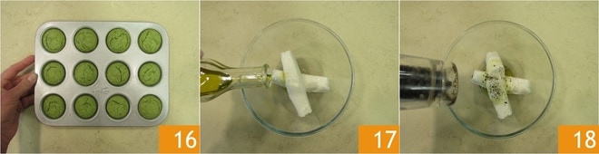Nach dem Backen nehmen Sie die Muffins aus dem Ofen und lassen sie abkühlen 16. In der Zwischenzeit bereiten Sie die Ziegenkäsecreme zu, indem Sie den Käse, einen Schuss Öl 17, das Salz und den Pfeffer 18 in eine Schüssel geben.