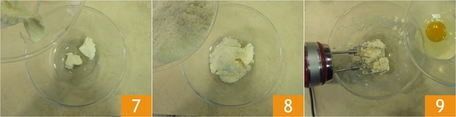 Geben Sie in eine Schüssel die weiche Butter 7 und den geriebenen Käse 8. Bearbeiten Sie die Zutaten mit einem elektrischen Handrührgerät etwa 2 Minuten lang. Fügen Sie das Ei zur Mischung hinzu 9 und arbeiten Sie, bis es vollständig aufgenommen ist.