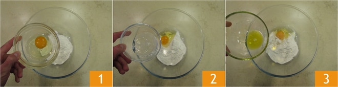 Um die Mini-Strudel mit Artischocken, Kartoffeln und Speck zuzubereiten, beginnt ihr mit dem Strudelteig: In eine Schüssel gebt ihr das Mehl, das Ei 1, das Wasser 2, das Öl 3 und eine Prise Salz.