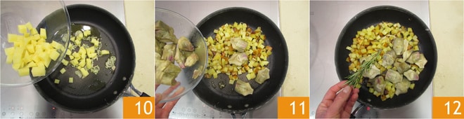 Gebt die Kartoffeln hinzu 10 und kocht sie für 5 Minuten. Dann fügt auch die Artischocken hinzu 11 und würzt sie mit Rosmarin 12.