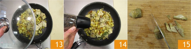 Deckt mit dem Deckel ab 13 und kocht sie 10 Minuten bei niedriger Flamme. Salzt und pfeffert 14. Schneidet die Artischocken in dünne Scheiben 15.