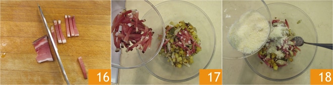 Schneidet den Speck in Streifen 16. In eine Schüssel gebt ihr das Gemüse, das in der Pfanne gebraten wurde, den Speck 17 und den geriebenen Käse 18.