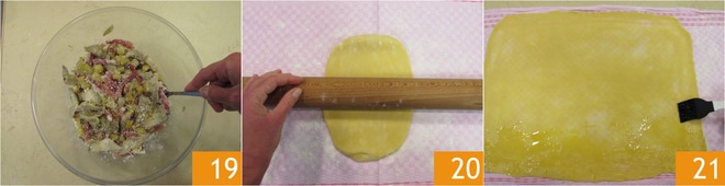 Vermischt alles, um es zu verbinden 19. Rollt den Teig zuerst mit einem Nudelholz auf einem Küchentuch aus und dann mit den Händen, um ihn sehr dünn zu machen 20. Bestreicht die Oberfläche mit Öl 21.