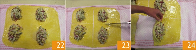 Legt die Füllung an die 4 Seiten 22, dann schneidet 4 Rechtecke um die Füllung herum 23. Faltet einen Teigrand um 24.