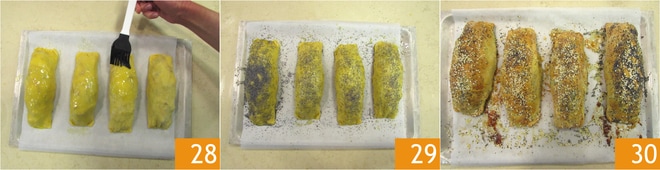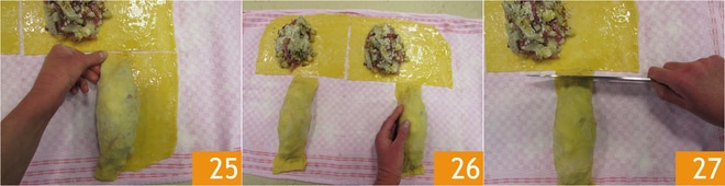 Bis ihr die gesamte Füllung eingewickelt habt 25, um ein Päckchen zu erstellen 26. Schneidet den überschüssigen Teig am Rand ab und drückt ihn zum Versiegeln 27.