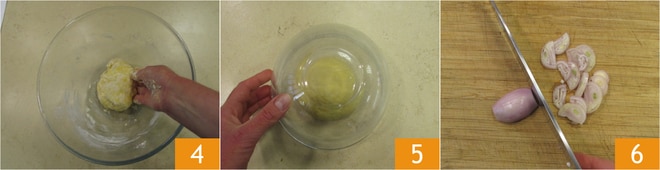 Knetet von Hand, bis ein homogener Teig entsteht 4, übertragt ihn dann auf die Arbeitsfläche, deckt ihn mit derselben Schüssel ab und lasst ihn 30 Minuten bei Raumtemperatur ruhen 5. Schält und schneidet die Schalotte in Scheiben 6.