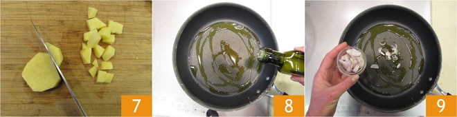Schält die Kartoffeln und schneidet sie in kleine Würfel von 1 cm 7. In eine Pfanne gebt ihr etwas Öl 8, fügt die Schalotte hinzu 9 und lasst sie 2/3 Minuten anschwitzen.